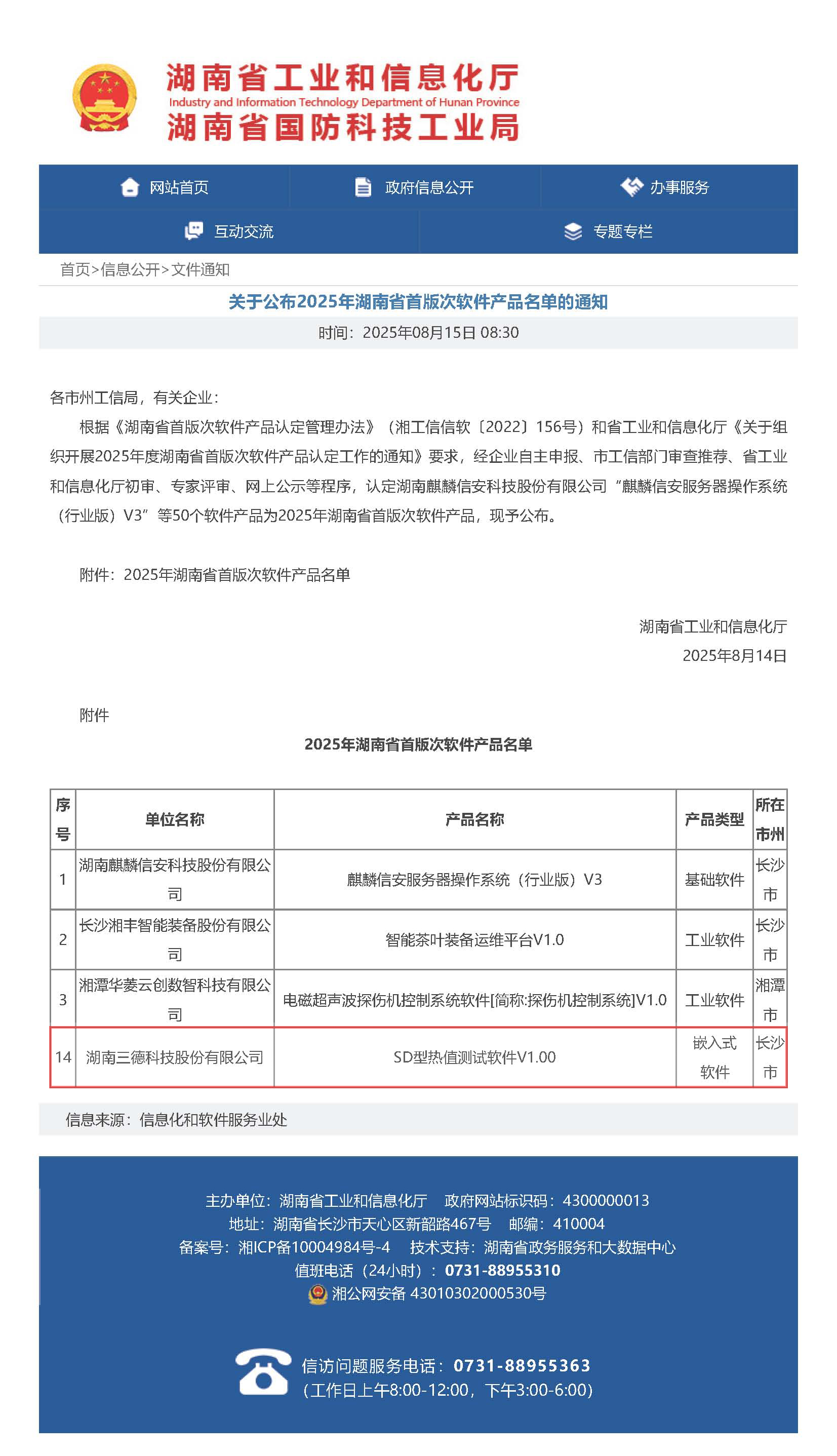 近日,湖南省工業和信息化廳公布《2025年湖南省首版次軟件產品名單》,三德科技自主研發的“SD型熱值測試軟件V1.00”成功入選。